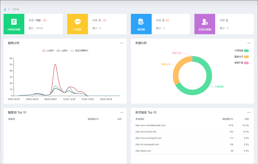 可按日、周、月等維度查看站點及頁面的PV、UV、IP、跳出率和平均訪問時長等數(shù)據(jù);