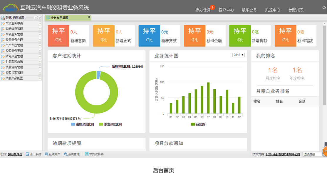 系統(tǒng)支持租賃車輛全流程化管理,整個車輛的融資租賃業(yè)務(wù)正常業(yè)務(wù)線、非正常業(yè)務(wù)線流程都形成閉環(huán)管理。